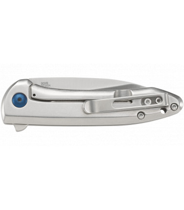 Features a 3 1/4" satin finished modified clip point blade of 7Cr17MoV Stainless steel. Stainless steel handle. Dual thumbstuds. Button Lock. Pocket clip