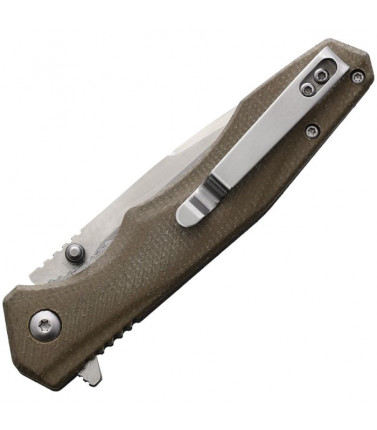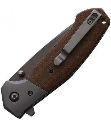 Brown Micarta handle scales over stainless steel liners. Stainless pocket clip oriented for right side tip-up carry. 4 1/2" closed.