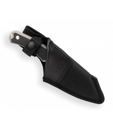 Features a 3 5/8" satin finished plain edge blade of BOS treated D2 high speed tool steel. Black canvas micarta handles. Dual thumbstuds. Lockback. Stainless pocket clip for right or left side tip-up carry.