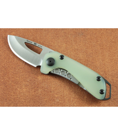 $94.99Buck 0417GRS Budgie with Natural Green G-10 handle. (13019) With the smaller size, the enlarged thumb hole makes for easy opening and the framlock provides strenght and security when working with the Budgie. SPECIFICATIONS: --Blade Steel: BOS Treated S35VN --Blade Shape: Drop Point --Blade Length: 2" --Handle: Stainless Framelock with Natural Green G-10 front scale and Black Flash Nitride coated lanyard loop. --Opener: Thumb Hole --Lock: Framelock --Pocket Clip: Right Side Tip-Up --Weight: 2.1oz USA -