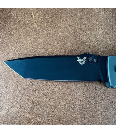 Features a 3 3/8" satin finished plain edge blade of S30V stainless steel. Matte Black finished aircraft grade aluminum handle. Blue anodized back spacer. Axis lock. Black pocket clip. I can't tell for sure if it has been carried or not - see some light indications, but may be simply from storage. Original factory edge and does not appear to have ever cut anything. Real nice example. Original Benchmade pouch. No box. Ships to you in padded zippered pouch.