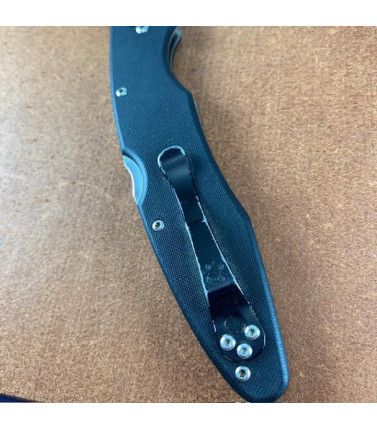 Here for your consideration is a lightly carried Spyderco C111G Captain designed by Jason Breeden. It features a unique and stout 3" compound ground blade of VG-10 Stainless steel. Skeletonized stainless steel liners and linerlock. Black G-10 handle scales. Black pocket clip. Handle drilled on all four ends for tip-up, tip-down, right or left side carry. 4 1/8" closed.