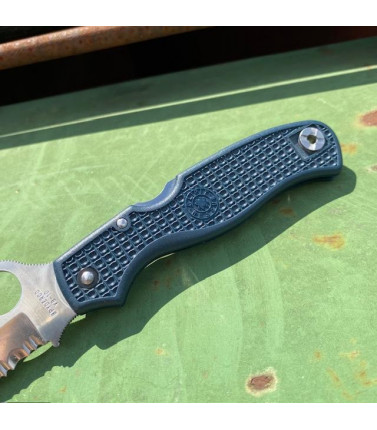 c. 2007 Spyderco Rescue with Emerson Wave feature. Gray FRN handle. Spyderedge VG-10 blade. Polished pocket clip. Knife is as new. No signs of use or carry. Original factory edge. Original box in good condition, showing storage wear.