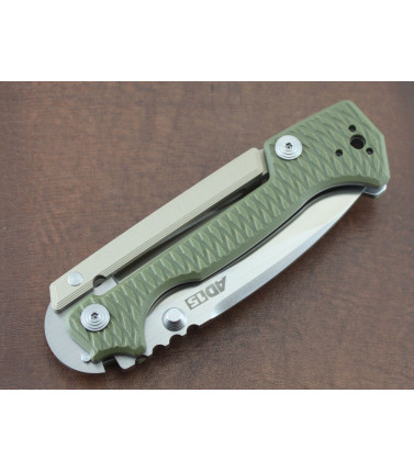 $169.97Cold Steel 58SQ Andrew Demko designed AD-15. The AD-15 might be the most comfortable, user friendly, sub 4 inch tactical folder Cold Steel has ever made! Modeled after Andrew Demkos patented original, it offers ambidextrous operation and opens and closes with one hand. The saber ground spear point blade comes with a false edge and includes jimping on the spine to assure great piercing ability and edge control when precision cutting is required. The AD-15s unique hybrid handle is what distinguishes it the most; because it features Andrews famous Scorpion Lock. You see, the bottom portion of the handle has 3D-machined G-10 scales mated to steel liners, while the upper portion of the handle, called the "yoke" is crafted from a 3D-machined 6061 aluminum billet that includes an integral back spacer which conceals a strong compression spring. To open the knife, simply engage the thumb stud and watch the yoke rise up, until it falls snugly into a deep notch cut in the blades tang. Held securely by constant pressure from the spring and, supported by the strength of ones grip, the Scorpion Lock is virtually immune from failure! SPECIFICATIONS: --WEIGHT: 6.5 oz. --THICKNESS: 3.8mm --BLADE LENGTH: 3 1/2" --HANDLE: 5" Long --STEEL / MATERIAL: S35VN Stainless --BLADE EDGE: Plain Edge --OVERALL: 8 1/2" --BRAND: Cold Steel --ITEM NUMBER: CS58SQ --ITEM NAME: AD-15 58SQ --UPC CODE: 705442018681 Country of Origin: Tiawan -