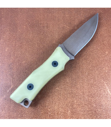 Du-Star Lahav. Distressed Copper finished blade. D2 tool steel flat ground blade. Full extended tang with oversize lanyard hole. Yellow Greenish G-10 handles. Distressed Black leather belt sheath. 8" overall. 3 3/4" blade. Israel
