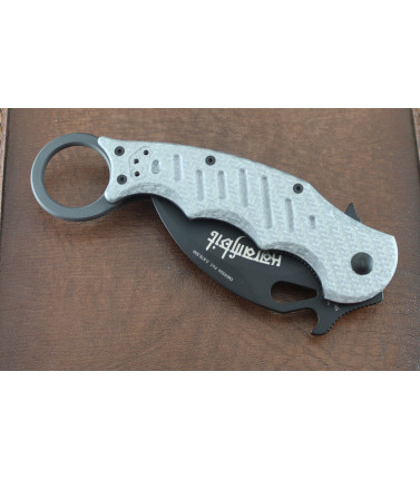 $159.97This Fox Karambit features a Bead Blasted N690Co Stainless blade and Gray T6-6061 Aircraft Grade Aluminum handle scales. With its thumbhole, flipper tab, and Emerson wave, this Karambit has a deployment option for any carry style.