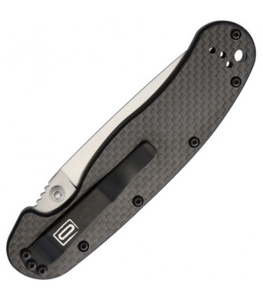 $47.99This Ontario Rat II folder features a 3" black finished full flat ground plain edge blade of AUS8 stainless steel. Smooth Carbon Fiber scales front and back over Stainless Steel frame. Linerlock. Dual thumbstuds. Pocket clip. Handle drilled and tapped on all four sides for right of left tip-up or tip-down carry. 4 1/16" closed. Taiwan