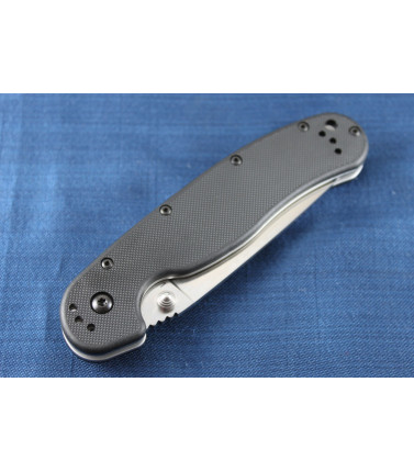 $39.97This Ontario Rat 1 folder features a 3 1/2" flat ground modified drop point plain edge blade of D2 tool steel. Black scales over full steel liners for strength. Linerlock. Dual thumbstuds. Drilled and tapped on all four corners for right or left side tip-up or tip-down carry. ~5" closed. A great quality knife with excellent blade steel at a reasonable price. Imported NOTE: D2 is a high carbon tool steel and may discolor or rust. This is not a flaw in the steel, simply it's nature. Keep blade clean, dry and lightly oiled if you wish to try and maintain the original finish.