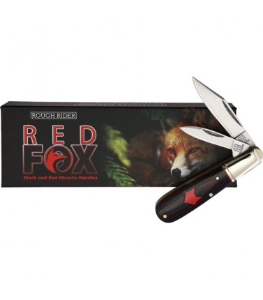 $17.99Rough Rider 2 blade Red Fox Mini Barlow. Black and Red Smooth Micarta handles with red liners. Red Fox inlay shield. Pinched and struck nickel silver bolsters. Brass pins and liners. Stainless steel blades.