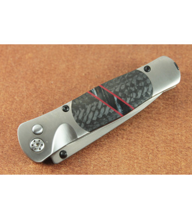 $172.50Santa Fe Stoneworks Tesoro with satin VG-10 Stainless Steel hollow ground plain edge drop point blade. The frame is brushed Titanium for strength and lightweight. The button-lock provides security when using the knife. The double sided handle inlays on this Teroso model are Carbon Fiber with Mammoth Tooth Inlays and Red G-10 spacers and liners. Removable or Reversable deep carry pocket clip. Closed Length: 3 1/2" Santa Fe -