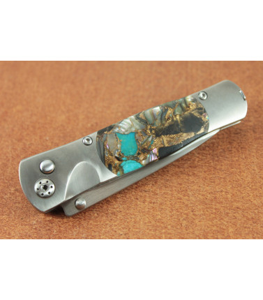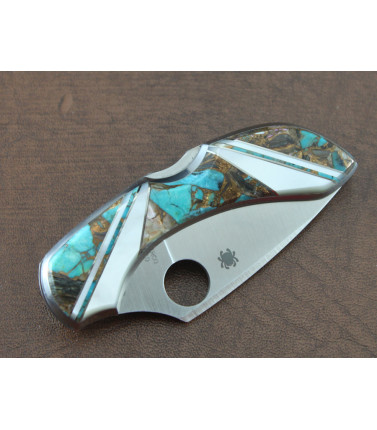 $195.00Santa Fe Stone Works has taken a Spyderco Dragonfly and expertly added a front scale of Turquoise, Abalone and Bronze with Mother of Pearl Sweeps. Back side is brushed stainless steel with pocket clip. 3 1/4" closed. Santa Fe fully guarantees their work for life of the knife. -