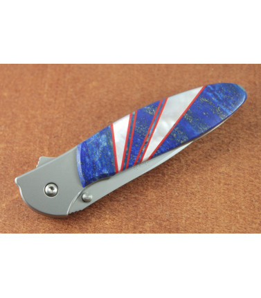$150.00Santa Fe Stoneworks embellished Kershaw Leek Assisted Opening Framelock. Features a satin finished plain edge blade. Frame is satin finished stainless steel. Handle onlay is Blue Lapis with Mother of Pearl and Red G-10 sweeps. 4" closed. Santa Fe -