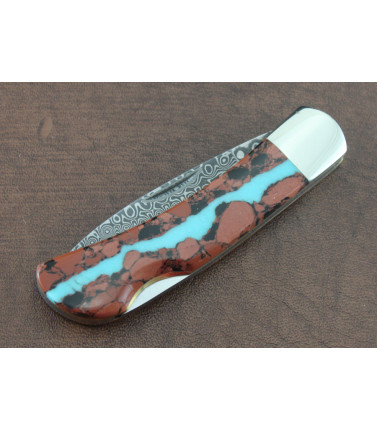 $97.50Santa Fe Stoneworks Folding Lockback with Deep Vein Turquoise front handle and rich wood back handle scale. Damascus blade. Nickel Silver bolsters. 3 1/8" closed. Includes Bufallo Hide pouch. -