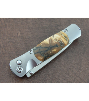 $265.00Santa Fe Stoneworks has taken a custom designed Tesoro Titanium framed Buttonlock gentleman's folder and expertly added a Wolly Mammoth Tusk inlay to both sides of this knife. VG-10 Stainless blade. Unique Elegance! Santa Fe fully guarantees their work for the life of the knife. Approx 3 1/2" closed. This knife is the best example I have seen. -