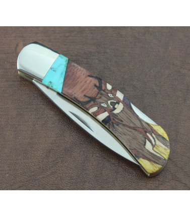 $70.00Part of the Painted Desert Collection. Italian marquetry, a wood inlay process dating back to the fifteenth century Renaissance, is re-created in the wildlife scenes and American Indian tones of the southwest. Stan Lance, a Native American of Laguna and Yaqui descent, and Andrew Mancuso, an Oregonian with a fascination for Nordic and Celtic influences and all things Tolkien, have taken the intricacies of this art form to its limit. These two artists have been perfecting their exotic hardwood marquetry together for over 20 years. Deer design built on a 3 1/8" closed folding lockback. Nail nick opening. Genuine Torquiose inlay. Nickel Silver bolsters. Rich grain wood back handle scale. 2 3/16" stainless drop point blade.