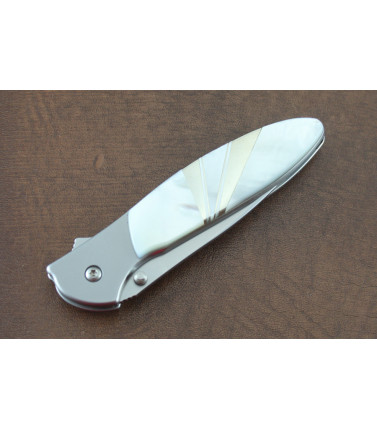 $142.50Santa Fe Stoneworks has taken a Kershaw Leek and expertly added a Mother of Pearl front scale with Nickel Silver sweeps. Back side of the Leek is the framelock mechanism. Assisted Opening. Pockel clip. Santa Fe fully guarantees their work for the life of the knife. USA -