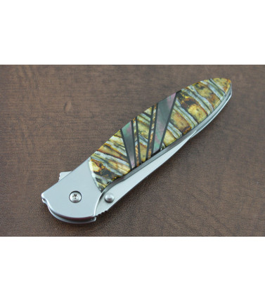 $180.00Santa Fe Stoneworks has taken a Kershaw Leek assisted opener and experty added a genuine solid Mammoth Bone onlay to the front side of this knife. Santa Fe fully guarantees their work for the life of the knife. Approx 4" closed. USA -