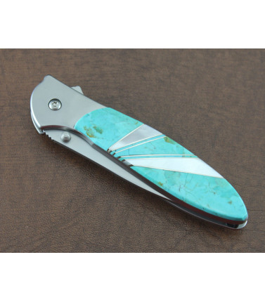 $142.50Santa Fe Stoneworks has taken a Kershaw Leek and expertly added a Turquoise front scale with Mother of Pearl Sweeps. Back side of the Leek is the framelock mechanism. Assisted Opening. Pockel clip. Santa Fe fully guarantees their work for the life of the knife. USA -