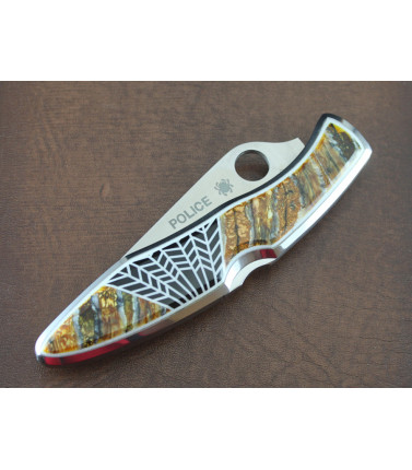 $345.00Santa Fe Stoneworks has taken a full size Spyderco Police and expertly added a Mammoth Molar front scale with a Black Jet inlay and White G-10 Spyderweb. Back side of the Police is brushed Stainless Steel. Pockel clip. Santa Fe fully guarantees their work for the life of the knife. USA -