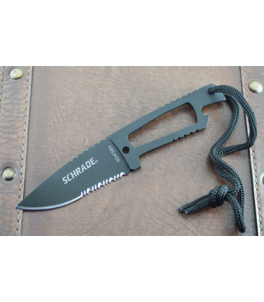 $19.99Black stainless steel partially serrated blade with skeletonized handle. 3.1" blade. 6.6" overall. Includes black Zytel sheath with neck chain and pocket clip.PRC -