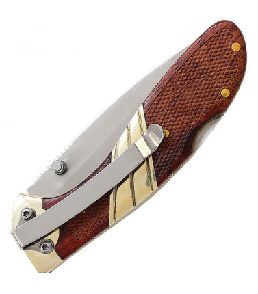 3.63" closed. 2.75" satin finish stainless drop point blade. Brown checkered wood handle. Nickel silver bolster(s). Inlay shield and sweeps. Dual thumb studs. Lockback. Removeable pocket clip.