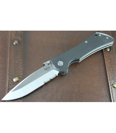 Southern Grind Bad Monkey with Satin finished Partially Serrated Drop Point Hollow Ground blade. Handle: Twill-weave carbon-fiber, textured matte finish Lock & Liner: 6AL4V Titanium Grind:Hollow Blade Steel: 14C-28N Licensed Emerson WAVE feature. Hardness: RC 59-61 Blade Length: 4" Blade Finish: Tumbled satin Weight: 4.97 oz. Overall Length: 9.25" Handle Length: 5.25" Blade Thickness: .130" USA All Bad Monkey knives are packaged with a Southern Grind koozie, paracord bracelet and leather key chain.