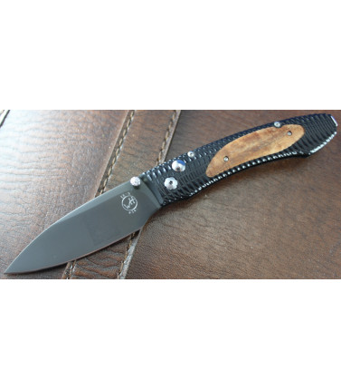 $275.00The E6-10 features a sculpted frame in aircraft grade aluminum, hard-anodized to military specs for a lifetime of superlative performance, and inlaid with a scale in signature wood. The E6-10 features a blade of tungsten-carbide coated D2 German tool steel, one of the most storied and respected steels in the modern history of cutlery. The pocket clip and fittings are crafted from stainless steel and titanium, tempered for optimal wear resistance in any condition. Our E Series is carried and worn for everyday use by stylish gentlemen, sportsmen, and by many of our troops at home and abroad. Materials & Artistry Black coated D2 steel T6061 aluminum alloy Signature wood One-hand button lock system Stainless steel pocket clip Dimensions: Blade 2.75" (69.9mm) Handle 3.50" (88.9mm) Overall open 6.13" (156mm) Handcrafted in the USA FREE GROUND SHIPPING ON ANY WILLIAM HENRY KNIFE PURCHASE!