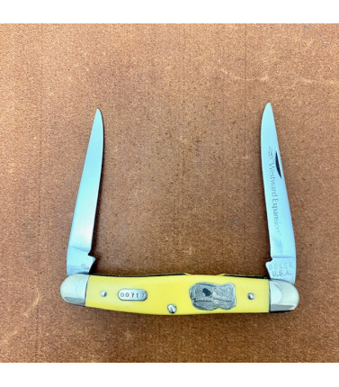 $59.97From a collection: C. 1976 Boker USA full size two blade Muskrat with twin high carbon clip blades. Commemorates the Louisiana Purchase. Blade embellished with "Westward Expansion" . Handle has special Louisiana Purchace inlay shield and individually serialized inlay shield. Yellow composite handles. Knife does not show carry or used. Appears to have original factory edge. Handle has couple light scratches - probably for handling and storage. Ever-so light tarnish spot on one of the blades. It's there, but very faint. Original box included showing storage wear expected from a knife pushing 50 years old. NOTE: While in overall good condition, be advised we obtained this knife from a collection, so please consider it used. -