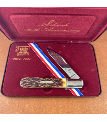 $119.00PRE-OWNED FROM A COLLECTION: Schrade (USA) 80th Anniversary Daddy Barlow. This 5" Daddy Barlow features Uncle Henry Handles. Etch Blade commemorating the three names of Schrade. Engine turned back-spring. Easy opener anniversary shield. Schrade embossed bolsters. Leatherette presentation box, velour knife pouch, and all paperwork in great condition, including original cardboard sleave which shows wear. Knife is near mint. Original factory edge. No signs of carry or use. Stunning presentation piece for the traditional collector. USA NOTE: While in excellent condition, be advised we obtained this knife from a collector, so please consider it used. -