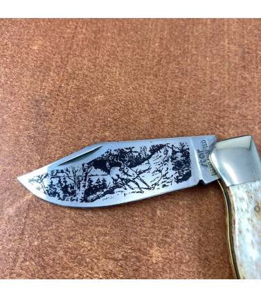 $39.97From a collection: Vintage c1970 Star Deer Slayer small folding hunter with smooth appalossa bone handles. Stainless Skinner blade. Brass pins and liners. Nickel Silver bolsters. Blade embellished with a deer scene. Knife is near mint. No signs of use or carry. Appears to have original factory edge. Real attractive knife at a good price! Ships in new presentation display box. NOTE: While near mint, be advised we obtained this knife from a collection, so please consider it used. -