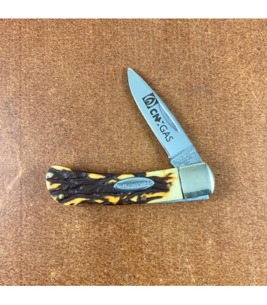 $15.00From a collection: Near mint Winchester Buckstag Lockback. CNX Award knife with CNX Logo on blade. Brass pins and liners. Nickel Silver bolsters. No signs of carry or use. Appears to have original factory edge. Ships in new presentation/gift box. 3 1/8" closed PRC NOTE: While in excellent condition, be advised we obtained this from a collector, so consider it used. -