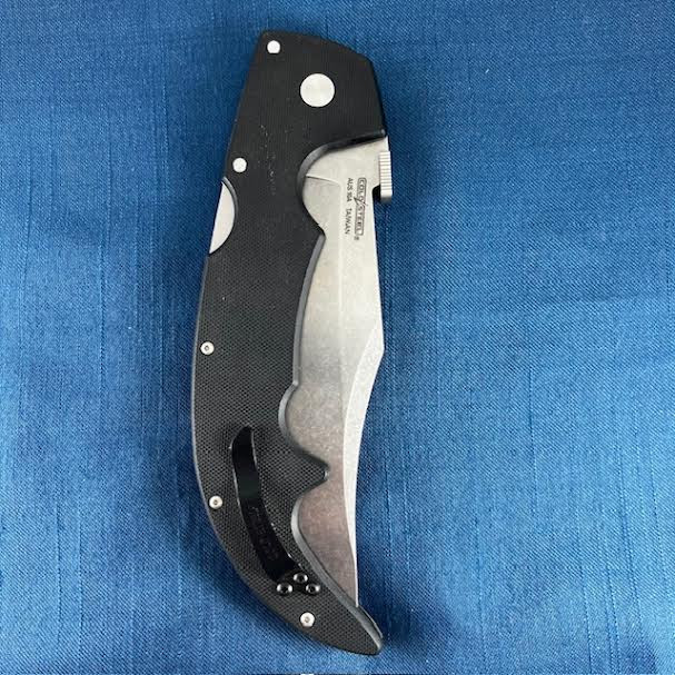 Features a 5 1/2" stonewashed plain edge blade of AUS 10A stainless steel. Thumb-plate opening. Tri-Ad lock. Textured G-10 handle scales. 6 3/4" closed. Two pocket clips. Taiwan