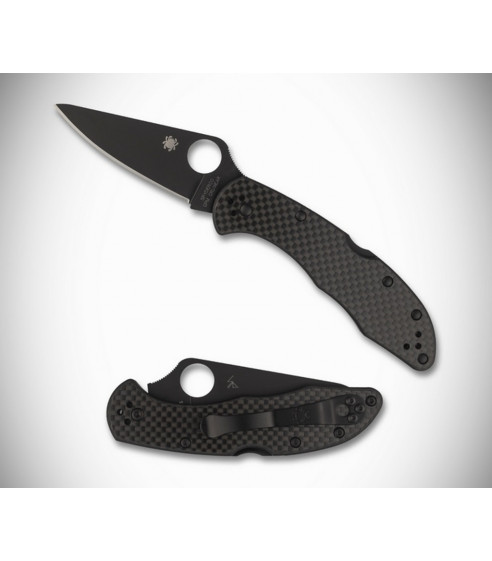 Spyderco's popular Delica 4 with black TiCN coated Cru-Wear blade and solid Carbon Fiber handles over skeletonzied black stainless liners.