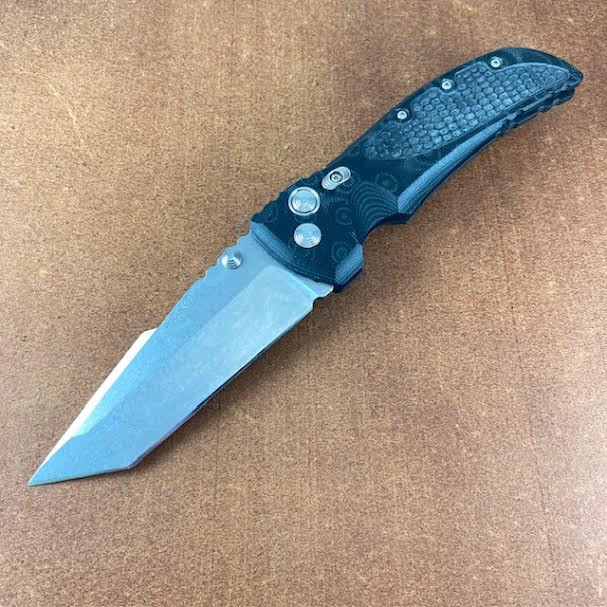 Features a 4" Cryo-treated stonewashed plain edge tanto blade of 154CM stainless steel. Dual thumb-studs. Button-Lock with manual safety lock. Black G-Mascus handles with Mini Piranha texture. Knife has been lightly used and carried. Solid knife with decades of life left in it.