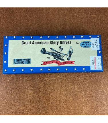 Boker Tree Brand USA Series I Great American Story Knife - Lafayette Escadrille (1779). Two blade Large Serpentine Jack. Main blade etched "War to End all Wars". Handle inlayed with Fighting Bi-Planes emblem. 4 1/8" closed. Made in FEB 1976. Original box and paperwork.