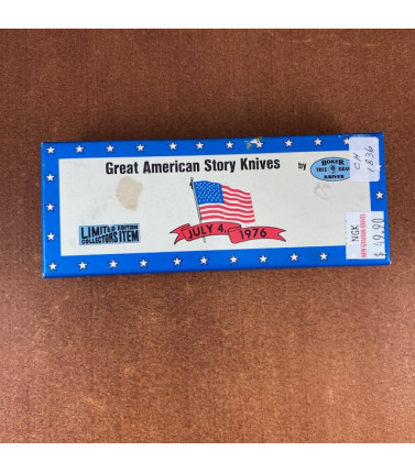 Boker Tree Brand USA Series I Great American Story Knife - July 4, 1976 (1781). Three blade Stockman. Clip blade etched "200 Years of Freedom". Handle inlayed with American Flag emblem. 4" closed. Made in JUL 1976. Original box and paperwork.