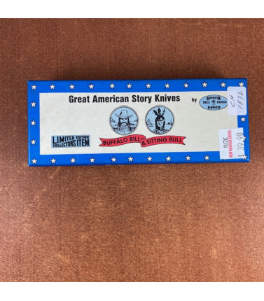 Boker Tree Brand USA Series I Great American Story Knife - Buffalo Bill and Sitting Bull (1777). Two blade Muskrat. Clip blade etched "Old Wild West". Handle inlayed with the Buffalo Bill and Sitting Bull emblem. 4" closed. Made in SEP 1975. Original box and paperwork.