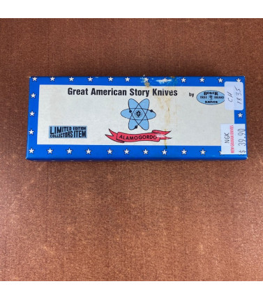 Boker Tree Brand USA Series I Great American Story Knife - Alamogordo (1780). Three blade Stockman. Clip blade etched "Dawn of the Atomic Age". Handle inlayed with Atomic emblem. 4" closed. Made in APR 1976. Original box and paperwork.