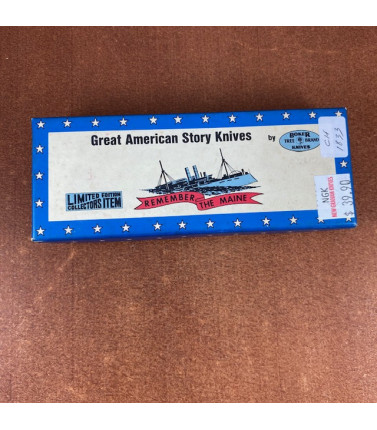 Boker Tree Brand USA Series I Great American Story Knife - Remember the Maine (1778). Four blade Congress. Main blade etched "Rise to World Power". Handle inlayed with the Remember the Maine emblem. 3 5/8" closed. Made in NOV 1975. Original box and paperwork.