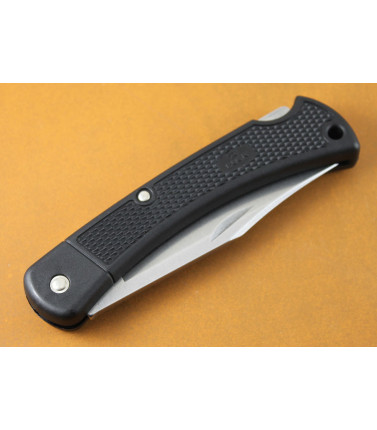 $33.95This Buck Folding Hunter LT is the new lightweigh version of the classic Buck 110. Featuring a 3 3/4" stonewashed plain edge clip point blade of 420HC stainless steel. Black lightweight nylon handles. Lockback. 4 7/8" closed. Knife weighs only 2.1 ounces. Black nylon belt sheath. USA -