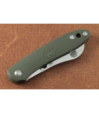 $86.25The Spydero Alcyone is a pocket-friendly and affordable high quality everyday carry knife. The Alcyone features a 2 7/8" flat ground plain edge blade of American made CTS BD1 stainless steel. High traction checkered Gray G-10 handle scales (you may see a little green if your eyes are like mine). Full skeletonized steel liners. Linerlock. Drilled and tapped on all four corners for right or left side tip-up or tip-down carry. 4 1/8" closed. PRC -