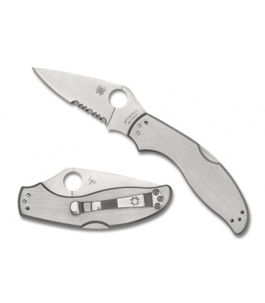 $54.38Spyderco C261PS UpTern Partially Serrated. The UpTern features a 2 3/4" full flat ground partially serrated blade of 8Cr13MoV Stainless Steel. Brushed Stainless Steel Handles. Pocket clip. Drilled and tapped on all four corners for right or left side tip-up or tip-down carry. Mid-lockback design. 3 3/4" closed. PRC