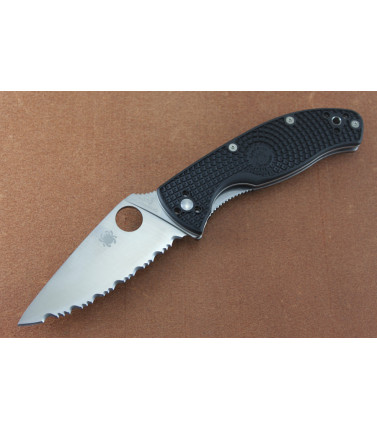 $56.25Spyderco C122PSBK Tenacious Partially Serrated Linerlock with Black FRN Handle Scales. --Black Fiberglass Reinforced Nylon (FRN) Handles.. --Walker Linerlock with jimped liner. --Full skeletonized steel liners. --4-way pocket clip....tip-up, tip-down, left or right. --Enlarged opening hole. --Spine jimping. --Flat grind. --Closed: 4 7/16" --Overall: 7 3/4" --Blade: 3 3/8" --8Cr13MoV stainless steel blade. --3.8 oz. PRC. -
