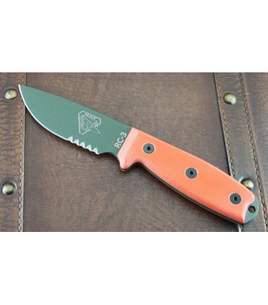 $99.97ESEE 3SM-OD Fixed Blade. Olive Drab Green Partially Serrated Blade with Orange G-10 Handle Scales. Modified Pommel. This is the model that started it all. After designing the RAT-3 for Ontario Knife Company, it was the first design brought over when ESEE Knives (Formerly RAT Cutlery) was formed. The ESEE-3 is still a favorite among law enforcement and military teams due to its light weight, thin profile and great ergonomics. SPECIFICATIONS AND FEATURES --Blade Steel: 1095 High Carbon Steel --Blade Finish: Textured Olive Drab Powder Coat --Blade Grind: Flat --Blade Shape: Drop Point --Blade Edge: Partially Serrated --Hardness: 55-57RC --Handle: Micarta --Pommel: Modified (rounded) --Construction: Full Tang --Brand: ESEE Knives --Model Name: 3 Series --Item Number: ESEE-3SM-OD --Model Number: 3SM-OD --Blade Length: 3.88" --Cutting Edge: 3.38" --Max Blade Thickness: 0.125" --Overall Length: 8.31" --Handle Length: 4.375" --Handle Thickness: 0.50" --Lanyard Hole: Yes --Weight: 5.2 oz (Knife Only) --Sheath: Molded Hardshell - Black - Clip Plate - Paracord - Cord Lock Country of Origin: USA -