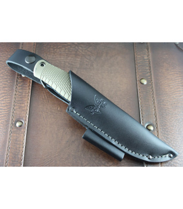 $180.00Benchmade 202 Leuku Fixed Blade, Theres no sense in beating around the bush when you can cut right through it. Enter the woods with peace of mind, and the 202 Leuku on your hip. This no-nonsense fixed blade is built for strenuous bushcrafting applications while maximizing in-hand comfort. Lock down your essentials. Food, water, knife, and everything in between. SPECIFICATIONS: --Blade Edge: Plain --Blade Finish/Color: Satin --Blade Steel: CPM-3V --Hardness: (60-62 HRC) --Blade Style/Shape: Drop-point --Glass Breaker: No --Handle Material: Forest Green Santoprene --Lanyard Hole: Yes --MOLLE Compatible: No --Sheath Type: Leather --BLADE LENGTH: 5.19" [13.18cm] ----BLADE THICKNESS 0.14" [3.556mm] ----OVERALL: 9.69" [24.61cm] --WEIGHT: 5.31oz [150.54g] --HANDLE THICKNESS: 0.8" [20.32mm] --SHEATH WEIGHT: 3.04oz [86.18g] --Brand: Benchmade --Model Name: Leuku --Model Number: 202 --Item Number: BM202 Country of Origin: USA -