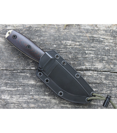 SPECIFICATIONS:--Blade Length: 5.51"--Overall Length: 10.24"--Blade Material: D2 Tool Steel--Blade Thickness: 0.20"--Blade Style: Sawback Clip Point--Blade Finish: Black Powder Coating--Handle Material: Black G10 with Hollow Brass Studs--Handle Thickness: 0.79--Sheath Material: Black Kydex--Designer: Dave Wenger--Weight: 9.3 oz. PRC