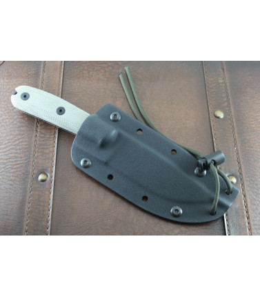 $109.97Overall length: 9.0" Cutting Edge Length: 4.06" Blade Length (end of handle to tip of blade): 4.5" Blade Width: 1.25" Weight (knife only): 7.4 ounces Drop point blade style. Maximum thickness: .188" 1095 Carbon Steel - 57 Rc. Removable lined Micarta handle slabs Rounded Pommel w/ lanyard hole Formed Ambidextrous Kydex sheath MOLLE Locks, lanyard and cord lock included Vertical and horizontal carry.