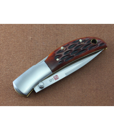 $40.00AMK7002 This Classic Collection Hawk with Honey Jigged Bone handles features a front lock design with stainless bolster and natural jigged bone handle. These knives share the original blade configuration found on all of our Classic Series knives. The AUS-8 blade sharpens easily to a razors edge. This is a knife built for more than a lifetime of use. This is a knife you can use and pass along for generations to come. Includes a finely crafted leather pouch embossed with the AL MAR logo. SPECFICATIONS: --Total Length: 5.75 in. --Closed Length: 3.25 in. --Blade Length: 2.5 in. --Blade Thickness: 0.08 in. (2mm) --Blade Material: AUS-8 (HRC: 57-58) --Blade Style: Talon --Blade Grind: Flat --Blade Finish: Satin --Thumb Studs: Yes - Dual --Edge Type: Plain --Handle Length: 3.25 in. --Handle Thickness: 0.38 in. --Handle Material: Honey Jig Bone --Color: Honey Brown --Liners: Brass --Weight: 2 oz. --Knife Type: Folding Front Lock --Opener: Manual one Hand Open with dual thumb studs --Lock Type: Front Lock --Pocket Clip: No --Sheath: Leather Slip Pouch PRC -