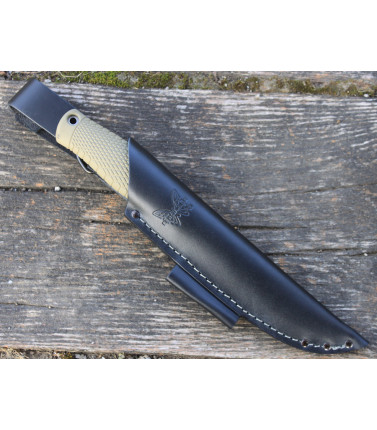 $180.00Benchmade 202 Leuku Fixed Blade, Theres no sense in beating around the bush when you can cut right through it. Enter the woods with peace of mind, and the 202 Leuku on your hip. This no-nonsense fixed blade is built for strenuous bushcrafting applications while maximizing in-hand comfort. Lock down your essentials. Food, water, knife, and everything in between. SPECIFICATIONS: --Blade Edge: Plain --Blade Finish/Color: Satin --Blade Steel: CPM-3V --Hardness: (60-62 HRC) --Blade Style/Shape: Drop-point --Glass Breaker: No --Handle Material: Forest Green Santoprene --Lanyard Hole: Yes --MOLLE Compatible: No --Sheath Type: Leather --BLADE LENGTH: 5.19" [13.18cm] ----BLADE THICKNESS 0.14" [3.556mm] ----OVERALL: 9.69" [24.61cm] --WEIGHT: 5.31oz [150.54g] --HANDLE THICKNESS: 0.8" [20.32mm] --SHEATH WEIGHT: 3.04oz [86.18g] --Brand: Benchmade --Model Name: Leuku --Model Number: 202 --Item Number: BM202 Country of Origin: USA -