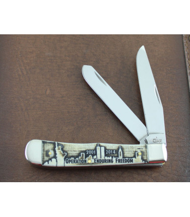 $99.99There is nothing like the feel of a Case knife in your hand. Durable, strong and beautifully designed, our hand-crafted Case knives are in a class of their own, which is one reason why they've been passed down from generation to generation, and sought after by collectors from all over the world. For an authentic, American-made work of art, nothing compares to a Case pocket knife, or hunting knife. W.R. Case & Sons Cutlery Co., hand-crafted knives since 1889. From the Case XX Image War Series this full size two blade Trapper features a smooth Natural Bone handle with laser etched Twin Towers graphics. Stainless Clip and Spey blades. 4 1/8" closed. USA -